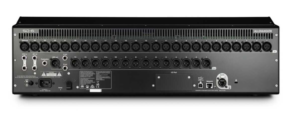 Mixážní pult SQ-6 je vybaven všemi vstupy a výstupy pro okamžitou práci. Díky “chytrému” SLink portu jsou podporovány již existující racky, expandéry a stage boxy (AB168, AR2412, AR84 - pouze 48kHz, a nebo DX168 se kterým plně využijete 96kHz technologie), díky tomu je rozšíření fyzických vstupů a výstupů velice snadné. SQ je možné dokonce připojit do dalšího SQ nebo dokonce systému dLive.