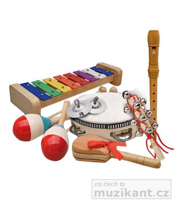 Perkusní sada 3: dřevěný bubínek, zvonkohra, maracas, dřevěné kastaněty, rolničky, prstové činely, flétna dřevěná.