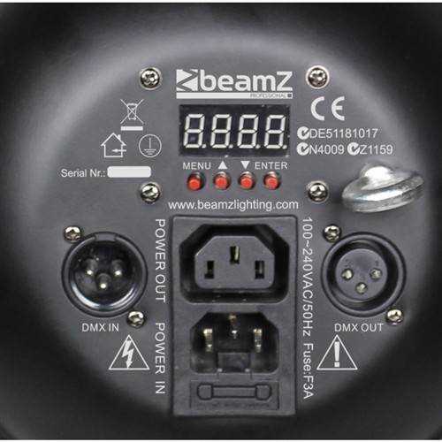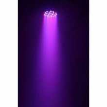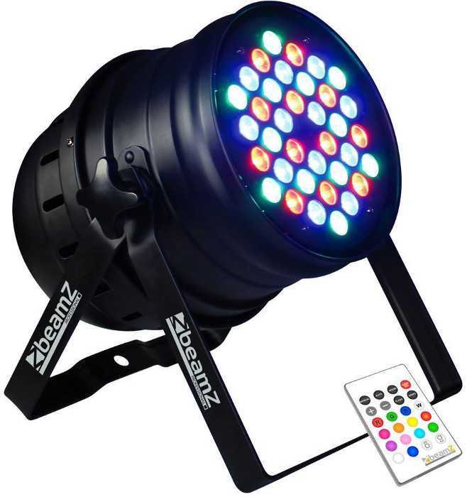 Reflektor LED PAR 64 osazený 1W diodami (12x červená, 12x zelená, 12x modrá). RGB míchání barev, vyzařovací úhel 25°. Ovládání DMX (6 kanálů), funkce Master/Slave, zabudovaný mikrofon pro ovládání hudbou. 9 vestavěných programů, stmívání, Strobo efekt. Pohodlné nastavení provozních režimů a DMX pomocí ovládacího panelu s LED displejem. Aktivní chlazení ventilátorem.