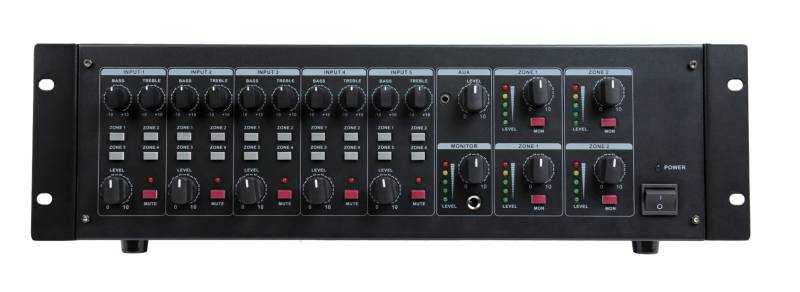 4-zónový multiroom zesilovač. Znamená to, že při všech 5 vstupech si navolíte (nasměrujete), do které zóny bude "hrát". Tím pádem v každé zóně (k dispozici jsou 4 monofonní zóny s výkonem 60 W každá) "hraje" jiný signál. To ocení především majitelé penzionů, restaurací a jiných společenských prostor, u kterých se žádá, aby každá zóna přenášela jiný signál. Např. v restauraci moderní hudba, na pokojích klasika. V případě, že výkon zón je nedostatečný, je možné na každou zónu napojit posilující zesilovač. S touto rozhlasovou ústřednou vlastně mícháte různé signály, jejich výkonové zesílení a směrování. Zesilovač je určen pro montáž do 19" RACK-u.