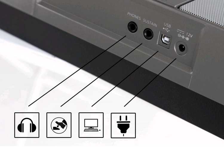 Na zadní straně jsou mimo jiné konektory pro volitelný sustain pedál a výstup na sluchátka. Připojený pedál může provádět jednu ze čtyř různých funkcí (sustain, soft, přepínání registrace a spuštění/zastavení stylu), které jsou definovány ve speciální položce menu.