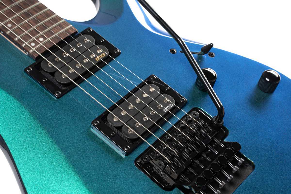 Moderní elektrická kytara s dvouzvratným tremolem a snímači EMG® RetroActive HOT 70 Set.
