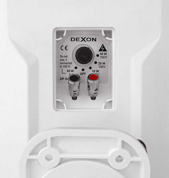 Připojení reprosoustav je možné ve vysokoimpedančním režimu (100 V), nebo v nízkoimpedančním režimu (8 Ω). Na to je určen přepínač výkonu (a tedy i hlasitosti) nad připojovacím terminálem. Dobrou vychytávkou je, že reprosoustavy dokážeme i zcela vypnout. Připojovací terminál a přepínač je proti vodě chráněn gumovou krytkou.