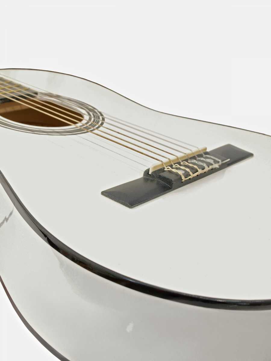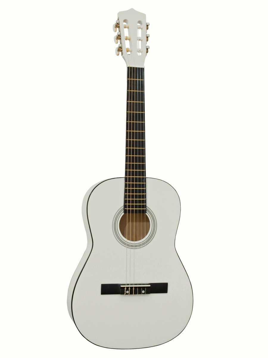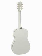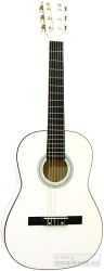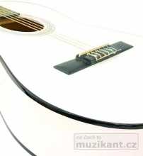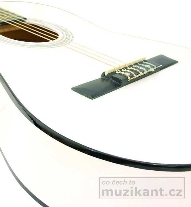 Klasická 3/4 kytara. Vrchní deska lípa, spodní deska a luby lípa, krk gaboon (okoumé), hmatník blackwood, menzura 580 mm, mechanika klasická, niklovaná. Barva bílá lesklá.: Vrchní deska: lípa