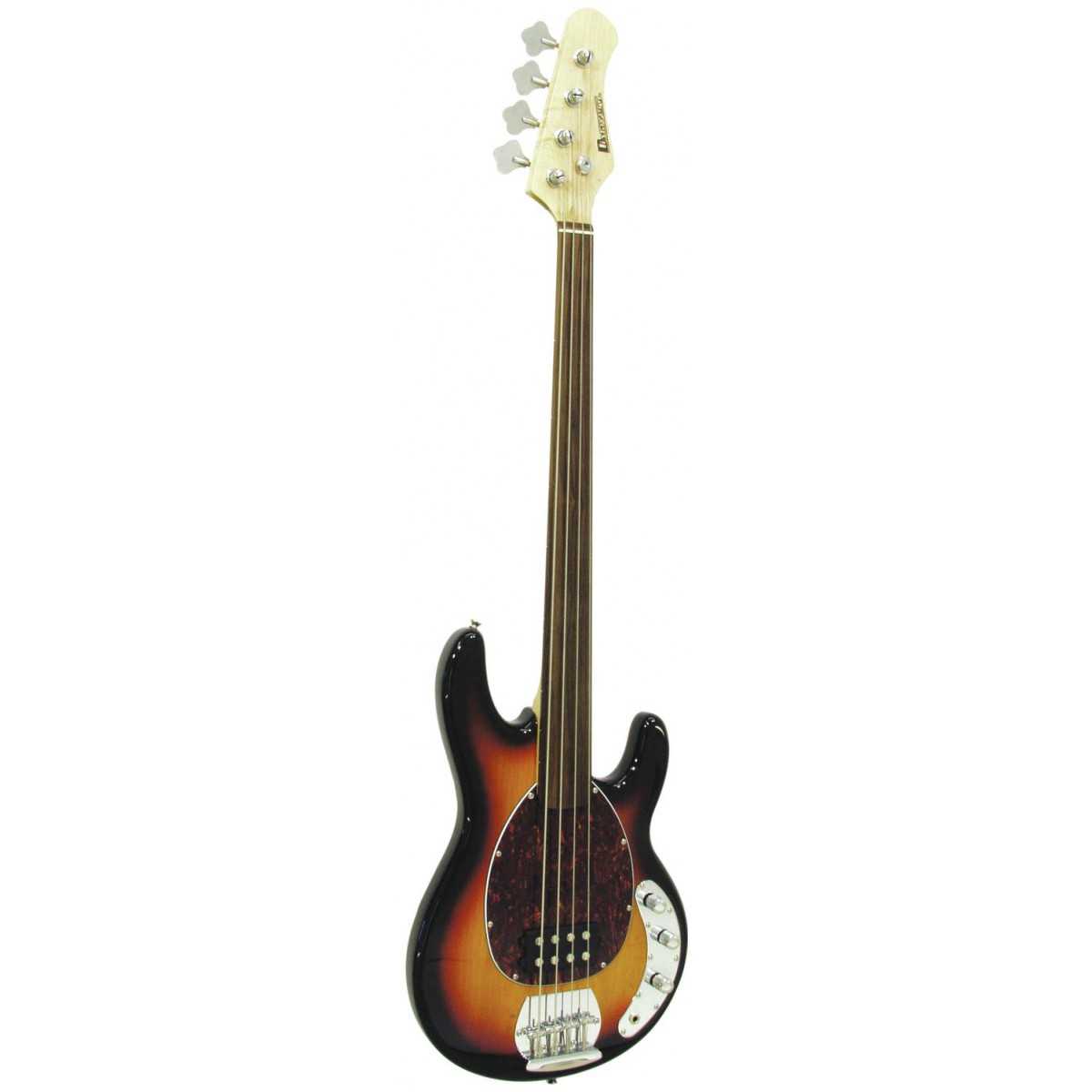Elektrická baskytara bezpražcová typu Music Man. Tělo lípa, želvovinový pickguard, šroubovaný krk javor, menzura 864 mm, hmatník blackwood, chromovaná mechanika, 1x dvoucívkový snímač (Humbucker), 2x ovládání hlasitosti, 1x ovládání tónu. Barva tobaccoburst lesklá.: Tělo: lípa
