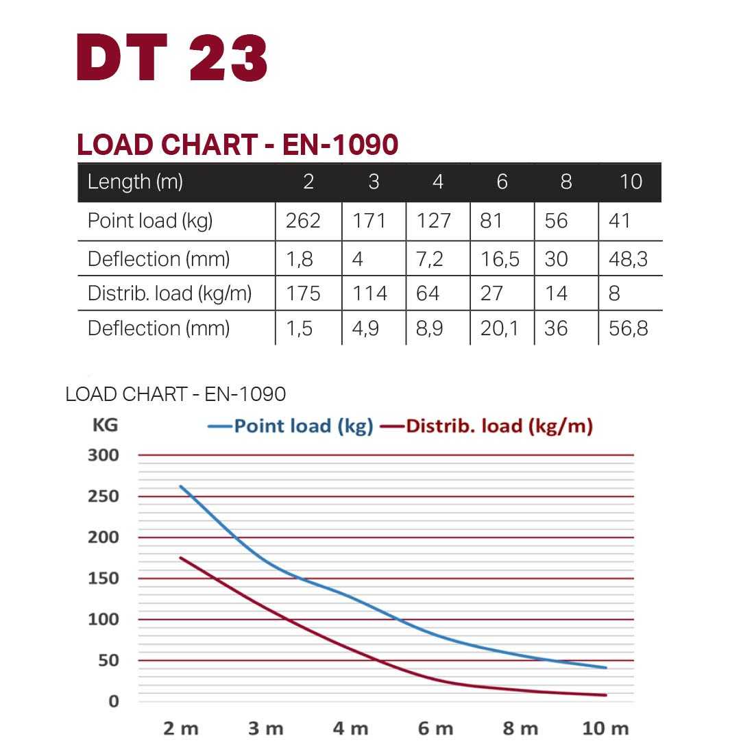 Tři hlavní trubky jsou vyrobeny z 35 mm hliníkové trubky s tloušťkou stěny 2 mm a dávají tomuto systému vynikající poměr pevnosti a hmotnosti. Vzpěry mají průměr 8 mm. Každý kus nosníku obsahuje všechny potřebné kónické spojky, ocelové kolíky a bezpečnostní spony. Systém DT 23/2 lze rozšířit o různé délky, rohy, T-odbočky a úhly.