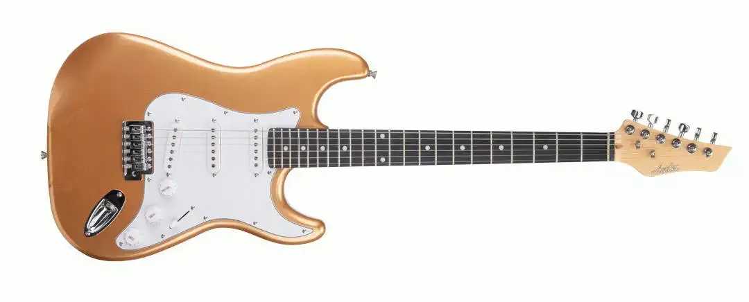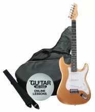Ashton AG232 GD PackPaket elektrické kytary, povlaku, řemenu, kabelu a online lekce hry na kytaru (v anglickém jazyce). Ashton AG 232 GD je elektrická kytara s tradičním tělem ve stylu Stratocasteru se třemi jedno cívkovými snímači Single Coil. Výborný nástroj pro začátečníky. Tělo kytary je z topolu, krk z javoru a hmatník ze SmartWoodu. Kytara je osazena 22 pražci, menzura je 25,5“. Pro nastavení zvuku můžete využít potenciometr hlasitosti Volume, 2x tónovou clonu Tone a 5 polohový přepínač. Barevné provedení: GD (Metallic Gold).
