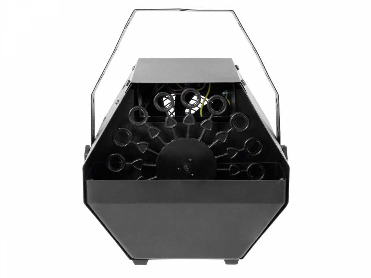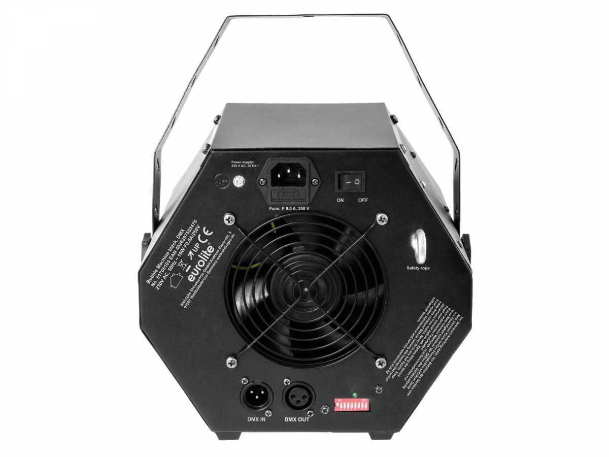 Univerzální a kompaktní výrobník umělých bublin, který pomocí výkonného ventilátoru a rotujícího "bubble" kola s nádržkou na cca 2l kapaliny je vhodný pro pevné instalace i pro mobilní použití. Ovládaní pomocí DMX olvadače (2 kanály) - DIP přepínače. Tento přístroj vyrábí populární mýdlové bubliny a rozfoukává je do místnosti či prostoru. Do přístroje nalijte speciální náplň (obj. číslo 51705280) není součástí výrobku, náplně jsou zcela neškodné zdraví a ředitelná vodou.: Napájení: 230 V AC, 50 Hz ~