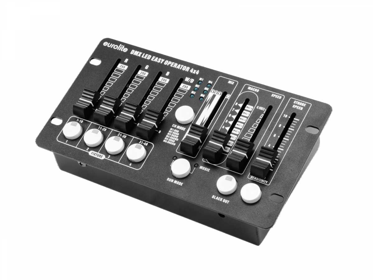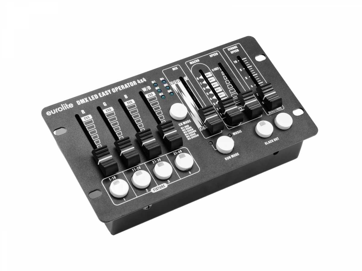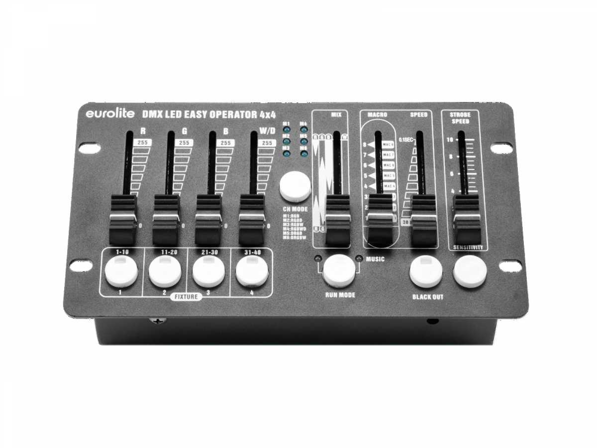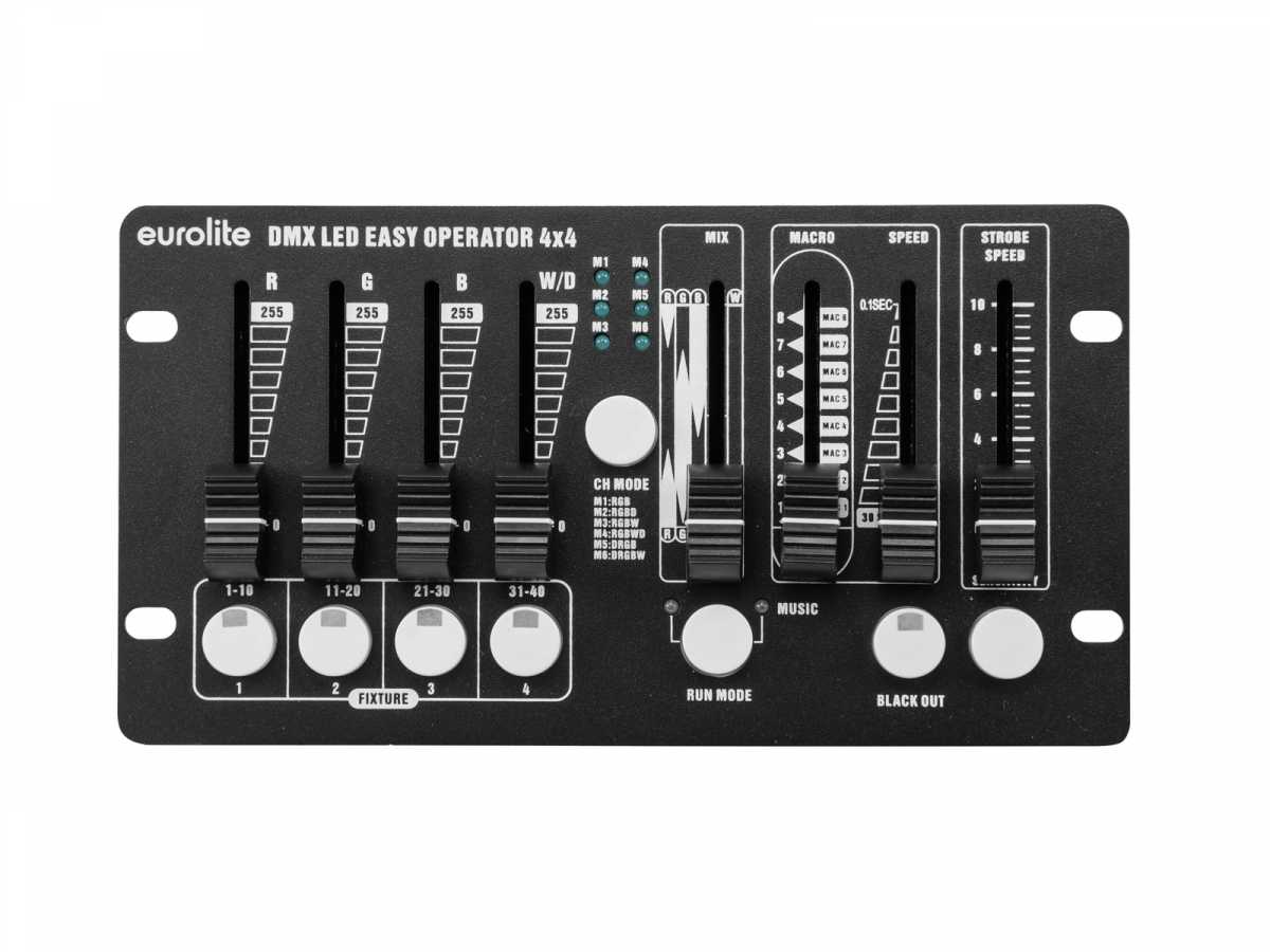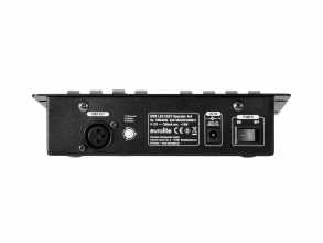 Jednoduchý DMX ovladač pro LED reflektory. Snadné ovládání 4 reflektorů s RGBW LED diodami, které lze ovládat společně nebo individuálně. Oddělené řídící kanály pro jednotlivé barvy (červená, zelená, modrá a bílá) a master. Různé režimy pro volbu barevné sekvence jednotlivých DMX kanálů. Ruční ovládání pomocí 4 tahových potenciometrů, 1 potenciometr pro přímé prolínání RGBW barev. 8 automatických provozních režimů s nastavitelnou rychlostí běhu programu. Ovládání hudbou pomocí zabudovaného mikrofonu s nastavitelnou citlivostí. Strobo efekt s možností změny rychlosti záblesků a funkce Blackout (okamžité vypnutí svícení). Kompaktní DMX ovladač vhodný pro mobilní akce, hudební produkce, taneční kluby a DJe, prezentace, předváděcí akce apod.: Napájení: 100-240V AC, 50/60 Hz