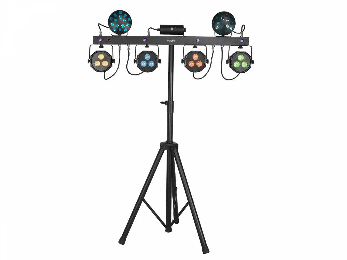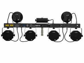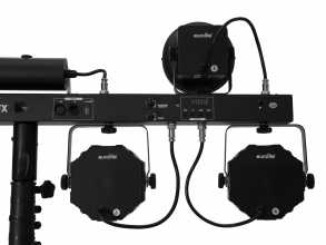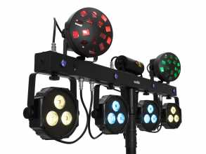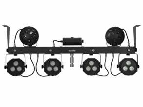 Světelný set LED efektů na DMX liště. Sestava obsahuje UV stroboskop (4x 1,5W W/UV LED), dvoubarevný RG laser (100 mW červená, 30 mW zelená), dvojici paprskových efektů (4x 3W RGB/WW LED v každém efektu) a čtyři výkonné reflektory (3x 4W QCL RGB/WW LED v každém spotu). Třída laseru 2M nevyžaduje zvýšená ochranná opatření. Velmi lehká konstrukce je ideální pro mobilní použití. Snadná montáž na stativ pomocí TV pinu s průměrem 28 mm. Zabudovaná řídící jednotka s ovládacím panelem umožňuje řízení systému pomocí DMX signálu, dodávaného IR dálkového ovladače nebo nožního bezdrátového ovladače (není součástí dodávky). Automatický provozní režim, funkce Master/Slave, 26 vestavěných programů, ovládání hudbou pomocí zabudovaného mikrofonu, podpora QuickDMX. Napájení pomocí profesionálních konektorů P-Con (možnost sériového napájení až 8 jednotek). Sestava je dodávána v praktickém přepravním pouzdře.: Napájení: 100-240V AC, 50/60 Hz