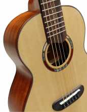 Výborně zpracované guitalele, které může být díky svým rozměrům jak vaší ideální kytarou na cestách, tak novým kouskem do sbírky zajímavých nástrojů. Přední deska z masivního smrku sitka v kombinaci se zadní deskou a luby z mahagonu i přes menší velikost tohoto nástroje poskytují výrazný a plný zvuk.