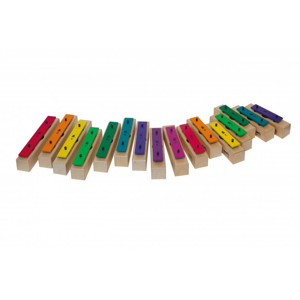 Jednotlivé kameny (chime bar) v barevném provedení Boomwhackers (každý kámen svoji specifickou barvu), jednotlivé tóny na výběr c2 - a3 na dřevěném korpusu. Bez paličky. Vyrobeno v Německu.