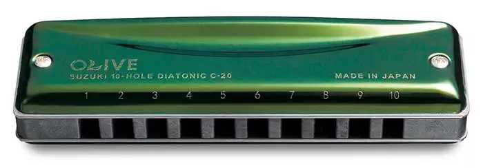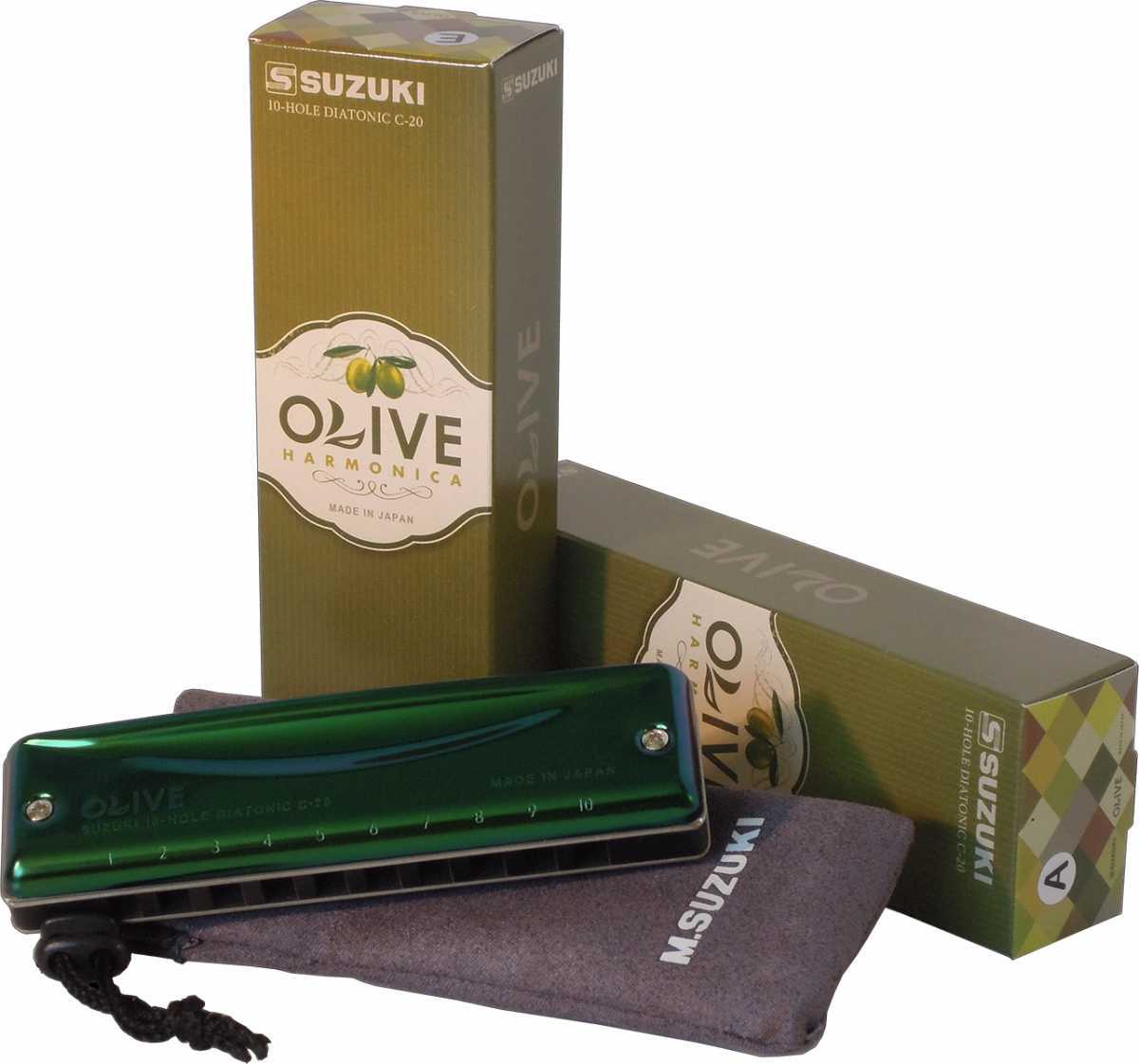 C-20 Olive je špičková diatonická harmonika firmy Suzuki. Kombinuje skvělou hratelnost řady Manji s robustním zvukem řady Promaster. Nabízí pevný, silný zvuk, rovnoměrně rozložený po celém zvukovém rozsahu, od silných basů, přes průrazné středy až po jemné výšky. Je vhodná pro hru předválečného blues až po moderní hudbu. Nabízí 10 kanálků, ocelový kryt v zelené barvě, kompozitové tělo simulující vlastnosti dřeva a fosforbronzové jazýčky. Je dostupná v laděních: C, G, A, D, E, F, Bb, B, F#, Eb, Ab, Db, Hi G a Low F. Rozměry harmoniky jsou 101 x 27 x 18 mm, její hmotnost je 65g (109g včetně pouzdra). Součástí dodávky je i látkové pouzdro.