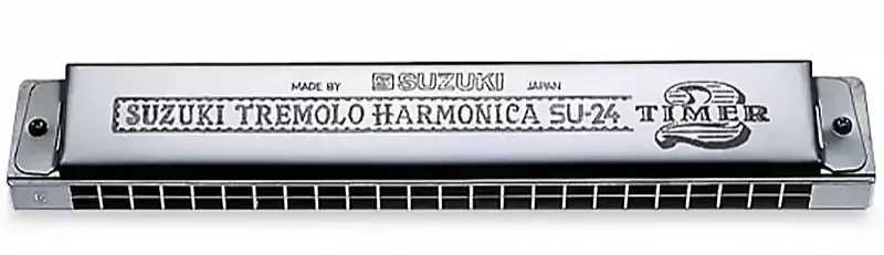 Suzuki SU-24 Twotimer je tradiční tremolo foukací harmonika s 24 dvojitými kanálky, která je vhodná pro folkovou nebo country hudbu díky svému charakteristickému tradičnímu zvuku. Má 24 otvorů a 48 jazýčků. Je vybavena kovovým krytem s gravírováním, plastovým hřebenem a laserem laděnými extra lehkými mosaznými jazýčky, které jí propůjčují speciální oktávový efekt. Součástí dodávky je i plastové polstrované pouzdro. Ladění A. Velikost harmoniky je 176 x 28 x 24 mm, její hmotnost je 126 g.