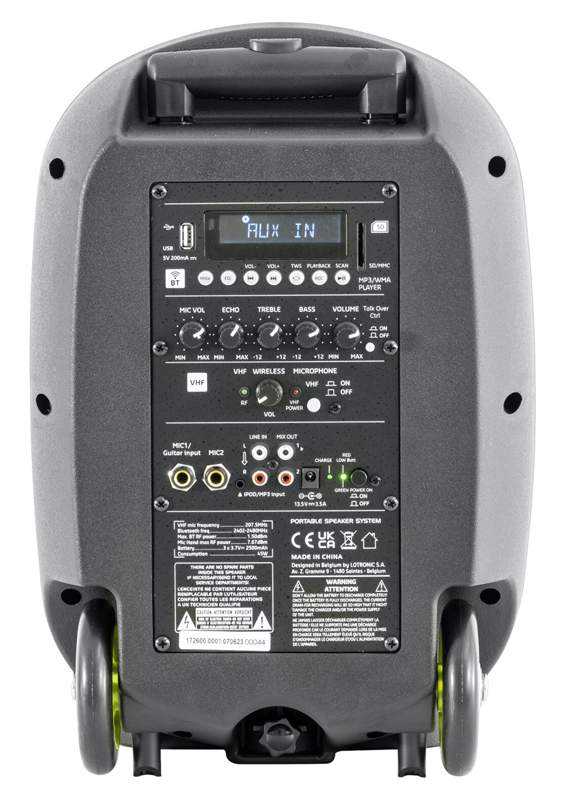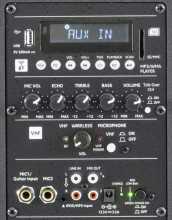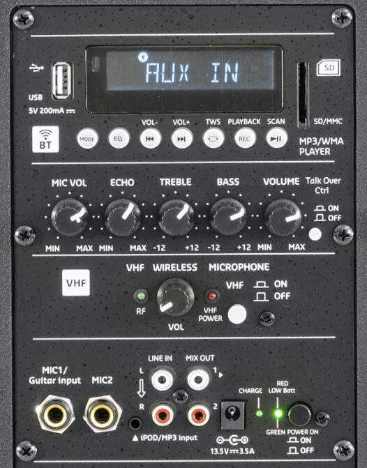 Vstupy a Výstupy: Nabízí možnost připojení dvou kabelových mikrofonů, 1x LINE vstup, LINE mix výstup a vestavěný MP3/WMA přehrávač/rekordér s USB konektorem, slotem pro SD kartu a Bluetooth připojením pro snadný přenos hudby.