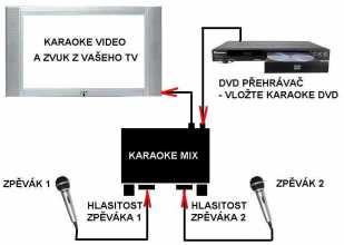Jedná se o jednoduchý karaoke mix - ke zvuku z DVD přehrávače je přimíchán a echem opatřen hlas jednoho či dvou zpěváků zpívajících do mikrofonu / mikrofonů. Obsluha je snadná - vše spojíme (dle obrázku) a postupně zapneme. Zapínání začíná od DVD přehrávače, pak zapneme Karaoke MIX a nakonec TV.