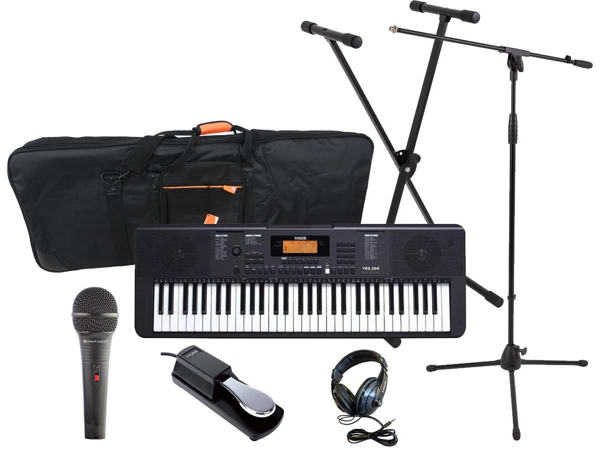 Virus VRS 200 SET5M je set kláves se stojanem. Digitální keyboard pro začínající hráče s 61 dynamickými klávesami, doprovodnými styly a možností připojení mikrofonu. Nabízí 585 zvukových rejstříků, 202 doprovodů a 157 skladeb pro výuku i cvičení hry, navíc si můžete nahrát i jednu vlastní skladbu. K dispozici je také USB vstup pro připojení nástroje k počítači nebo k dalším MIDI zařízením. Součástí dodání je plastový notový stojánek, napájecí adaptér zdarma a český překlad uživatelského manuálu. Nástroj umožňuje i napájení a hru pomocí baterií.