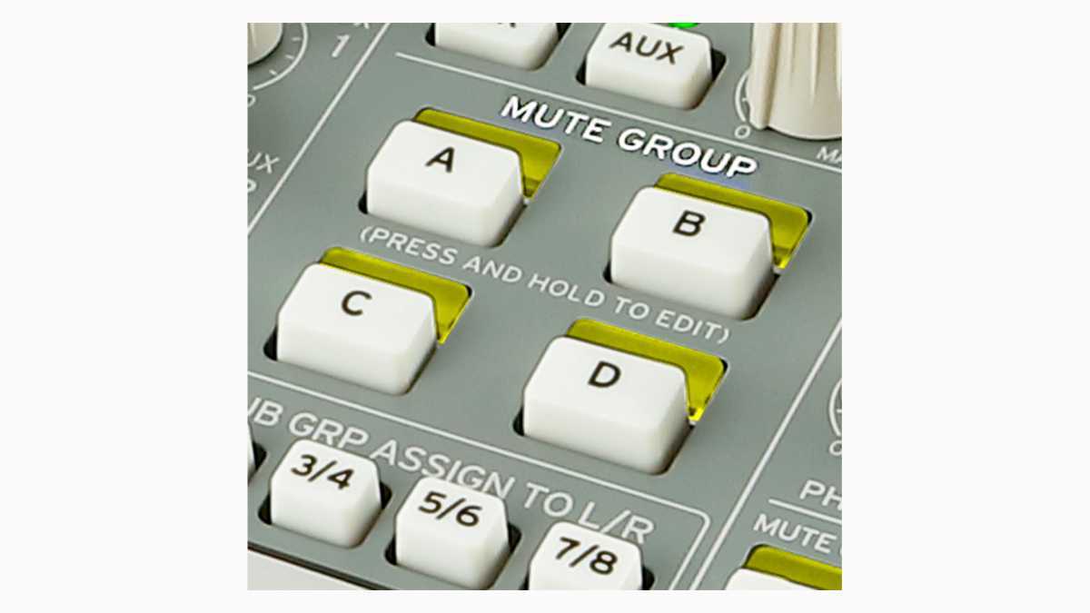Umožňuje okamžitě vyvolat různé kombinace kanálů pro různé kapely, různé skladby, zvukové zkoušky, sólové akustické čísla, bubenické sólo nebo jednotlivé části mše (sbor, kapela, sloužící). Máte k dispozici čtyři programovatelné Mute skupiny, každou s vlastním HW tlačítkem.