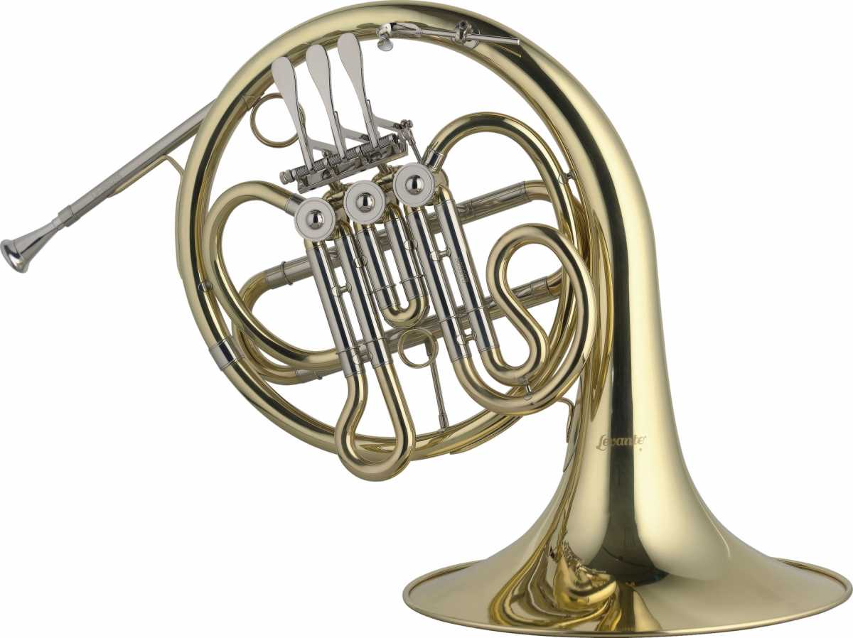 B lesní roh (jednolesnice) Junior, 3 ventily, mechanika double ball, zlatomosazná ústnice, vrtání 11,5 mm, ozvučník 280 mm, 3 cylindrové ventily, transparentní lak, nylonové pouzdro.: Svod: zlatá mosaz, s vodním klíčem