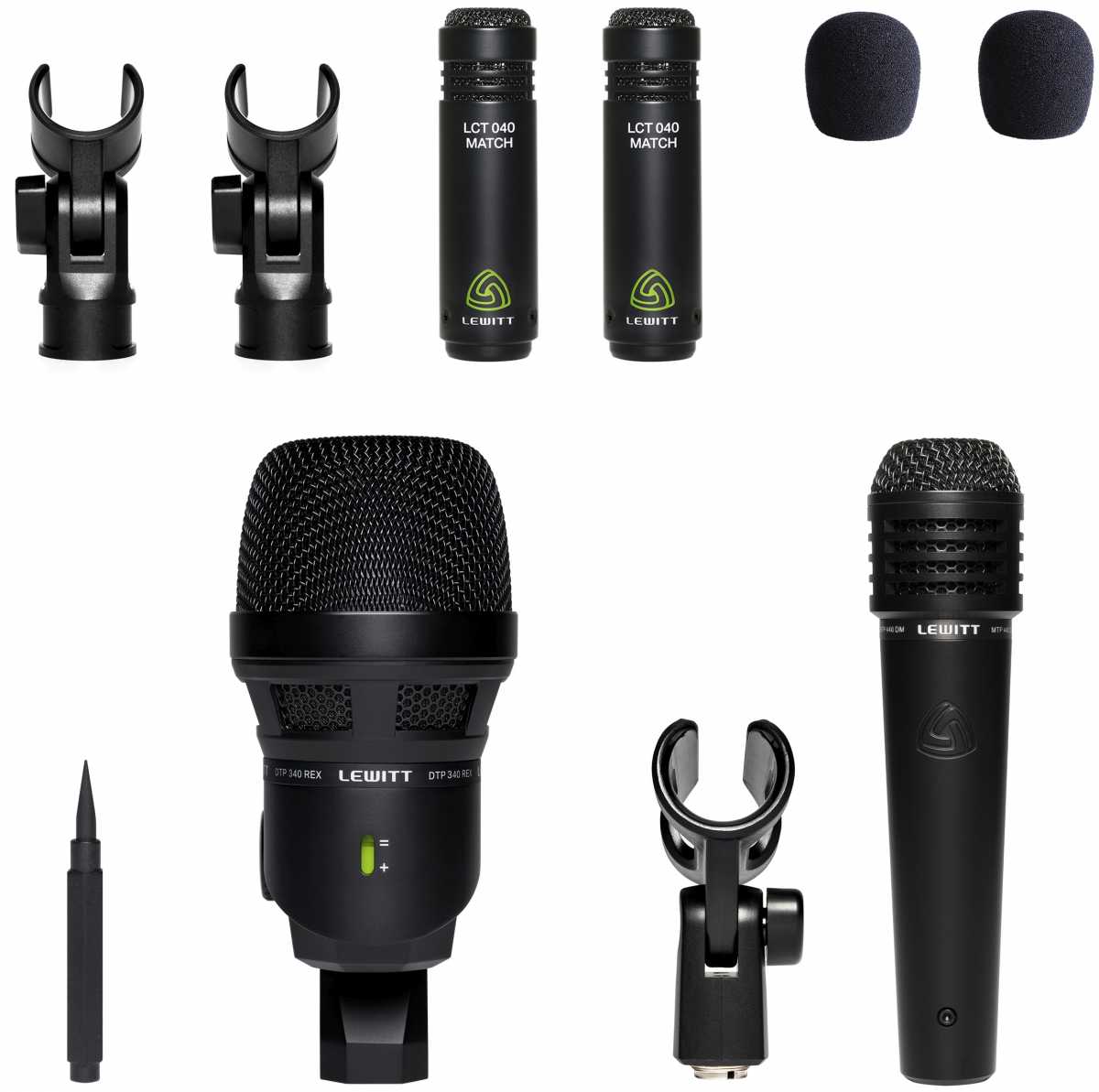 Lewitt BEATKIT je vhodná pro ozvučení bicí soupravy v nahrávacím studiu nebo při živém vystoupení. Sada obsahuje DTP 340 REX pro basový buben, MTP 440 DM pro snare bubínek a stereo pár LCT 040 MATCH pro nahrávání overhead. Součástí balení jsou také tři mikrofonní držáky, dva protivětrné kryty pro tužkové mikrofony a robustní kufřík pro bezpečný transport.