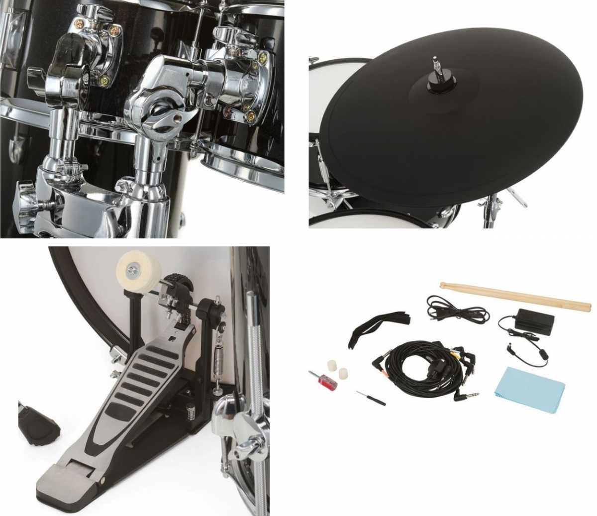 Včetně hardwarového balíčku s 2x stojany na činely, pedálem pro basový buben, mechanikou na hi-hat, stojanem na virbl, držákem na dvojitý tom a držákem pro bicí modul