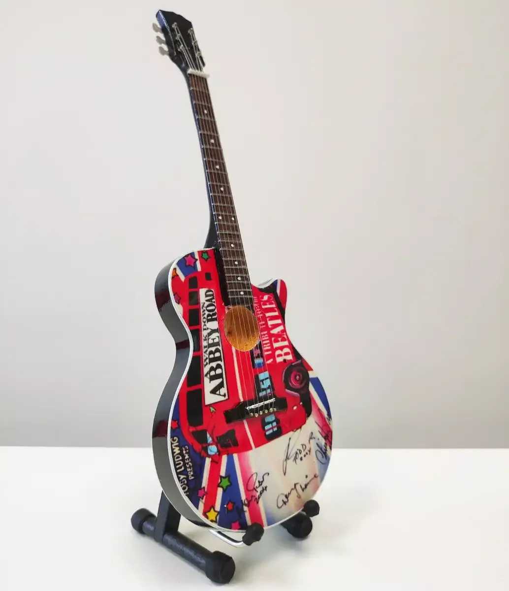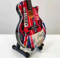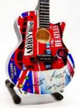 Exkluzivní miniatura kytary, vyrobená ze dřeva se všemi detaily nástroje. Krásné ruční detailní zpracování. Délka kytary cca 25 cm, šířka 7 - 9 cm. Včetně stojánku. V dárkové krabičce. Skvělý dárek na ozdobu pokoje nebo pracovního stolu pro zapáleného kytaristu. Model The Beatles Acoustic The Abbey Road Tribute.