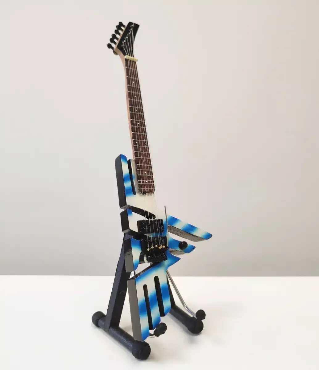 Exkluzivní miniatura kytary, vyrobená ze dřeva se všemi detaily nástroje. Krásné ruční detailní zpracování. Délka kytary cca 25 cm, šířka 7 - 9 cm. Včetně stojánku. V dárkové krabičce. Skvělý dárek na ozdobu pokoje nebo pracovního stolu pro zapáleného kytaristu. Model Eddie Van Halen Logo VH Charvel Jackson.