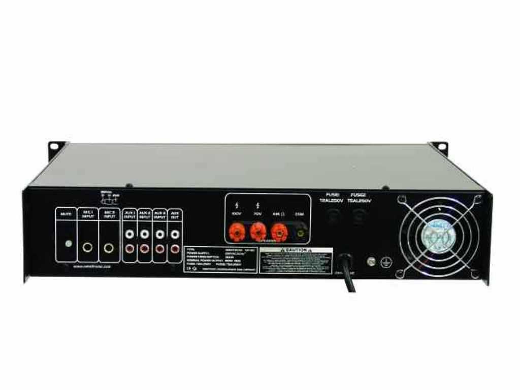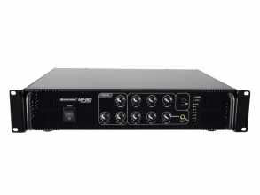 Mixážní zesilovač o výkonu 180W RMS v robustním rackovém provedení je ideální pro pevné instalace. Přes šroubovací svorky lze připojit reproduktory 70/100 V nebo 4-16 Ohmů. Připojit lze až 3 mikrofony a až 3 zařízení na úrovni linky. Na výstupu je 2-pásmový ekvalizér. Zesilovač má vestavěný gong, ventilátorové chlazení, LED indikaci signálu. Mikrofonní vstup na předním panelu s možností priority (při hlášení do mikrofonu se utlumí hudba). Výška 2 HE.: Napájení: 230V AC, 50 Hz