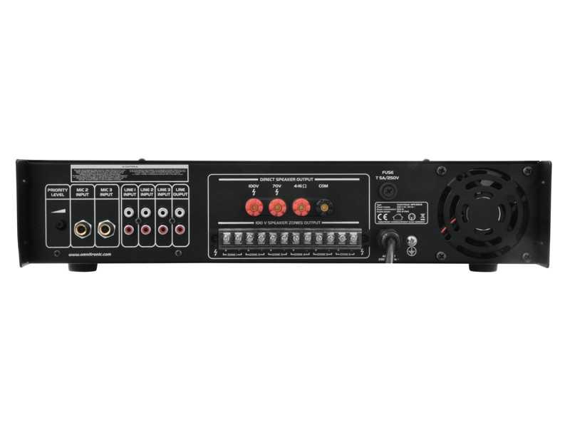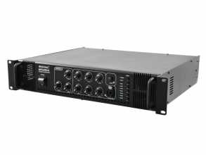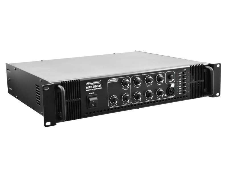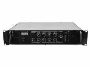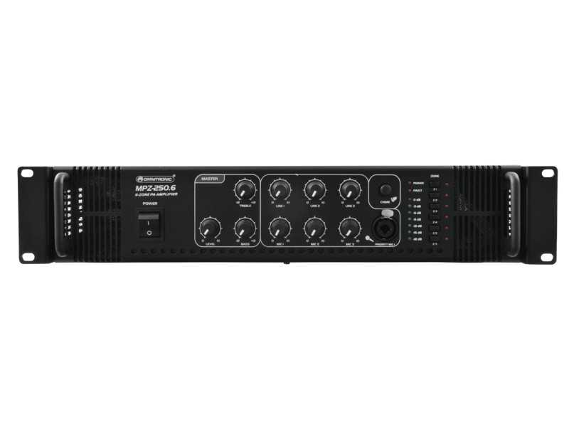 6-zónový mixážní zesilovač o celkovém výkonu 250W RMS v robustním rackovém provedení je ideální pro pevné instalace. Přes šroubovací svorky lze připojit reproduktory 70/100 V nebo 4-16 Ohmů. Jednotlivé zóny lze tlačítky buď zapnout nebo vypnout - nelze je samostatně regulovat, pouze celkově. Připojit lze až 3 mikrofony a až 3 zařízení na úrovni linky. Na výstupu je 2-pásmový ekvalizer. Zesilovač má vestavěný gong, ventilátorové chlazení, LED indikaci signálu. Mikrofonní vstup na předním panelu s možností priority (při hlášení do mikrofonu se utlumí hudba). Výška 2 HE.: Napájení: 230 V AC, 50 Hz