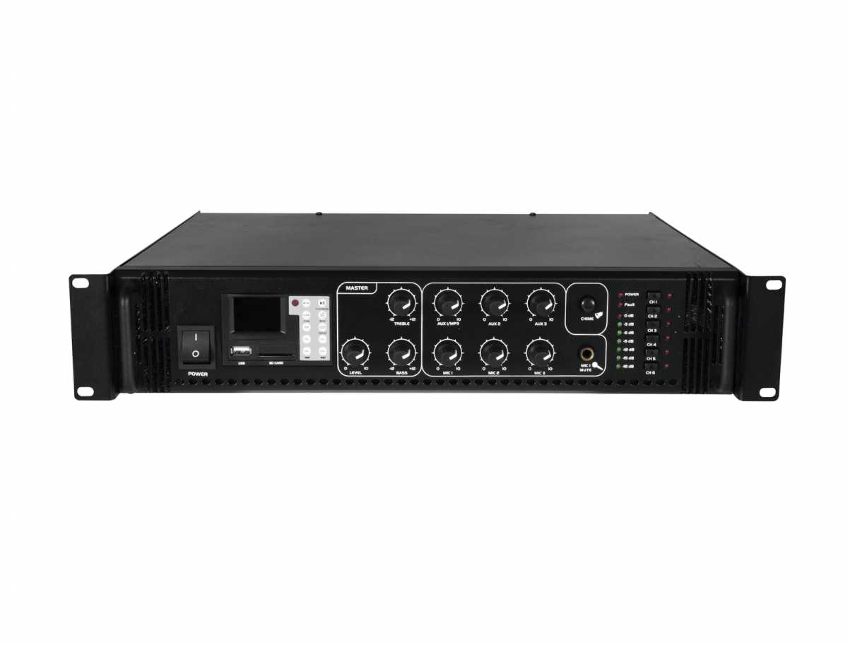 6-zónový mixážní zesilovač s MP3 přehrávačem o celkovém výkonu 650W RMS v robustním rackovém provedení je ideální pro pevné instalace. MP3 přehrávač má slot pro SD kartu, USB vstup, LCD displej a IR dálkové ovládání. Přes šroubovací svorky lze připojit reproduktory 70/100 V nebo 4-16 Ohmů. Jednotlivé zóny lze tlačítky buď zapnout nebo vypnout - nelze je samostatně regulovat, pouze celkově. Připojit lze až 3 mikrofony a až 3 zařízení na úrovni linky. Na výstupu je 2-pásmový ekvalizer. Zesilovač má vestavěný gong, ventilátorové chlazení, LED indikaci signálu. Mikrofonní vstup na předním panelu s možností priority (při hlášení do mikrofonu se utlumí hudba). Výška 2 HE.: Napájení: 230 V AC, 50 Hz