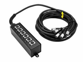 Multicore kabel se stageboxem 6IN XLR, pro vícecestný přenos signálu mezi pódiem a mixážním pultem, 6 signálních cest, 3-pinové konektory XLR, vysoce flexibilní kabel mulitcore. Délka 10 m.: Konektory: 6x XLR (M) na kabelu, 6x XLR (F) ve stageboxu