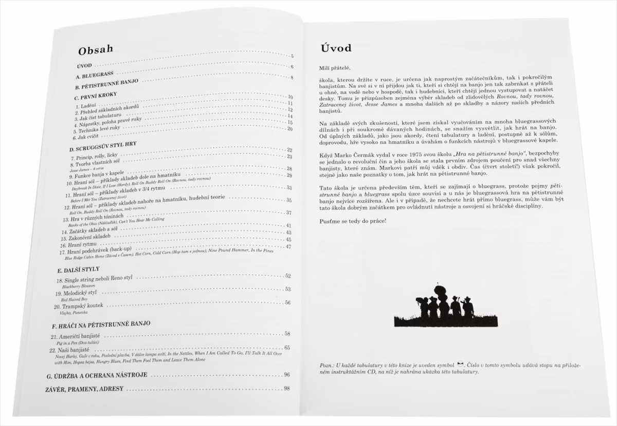 Učebnice pro bluegrassové bendžisty, ale i pro ty, kteří chtějí na bendžo hrát jen tak sami či s partou. Množství tabulatur s rozepsanými sóly (Roll on Budy, Blackberry Blossom, Novej Harley, Panenka, …). Životopisy slavných amerických hráčů, rozhovory s našimi předními bendžisty a ukázky jejich sól. Odkazy na internetové bluegrassové adresy.