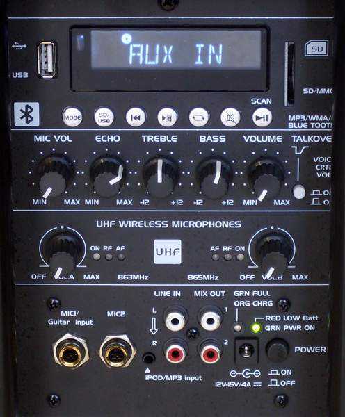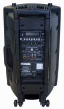 Na zadním panelu pak máte možnost připojení dalších dvou drátových mikrofonů, RCA Line vstup a výstup, vestavěný MP3 přehrávač s USB vstupem, slot pro SD kartu nebo FM tuner. Dále umožňuje komfortní bezdrátovou konektivitu pomocí Bluetooth takže lze hudbu snadno přehrávat bez kabelů přímo z vašeho notebooku nebo mobilního telefonu.