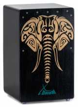 Designový cajon s potiskem Elephant. Integrovaný basový port, tělo vyrobené z HPL, horní polovina přední desky přišroubována, trvale nainstalovaný snare systém, asertivní basy.
