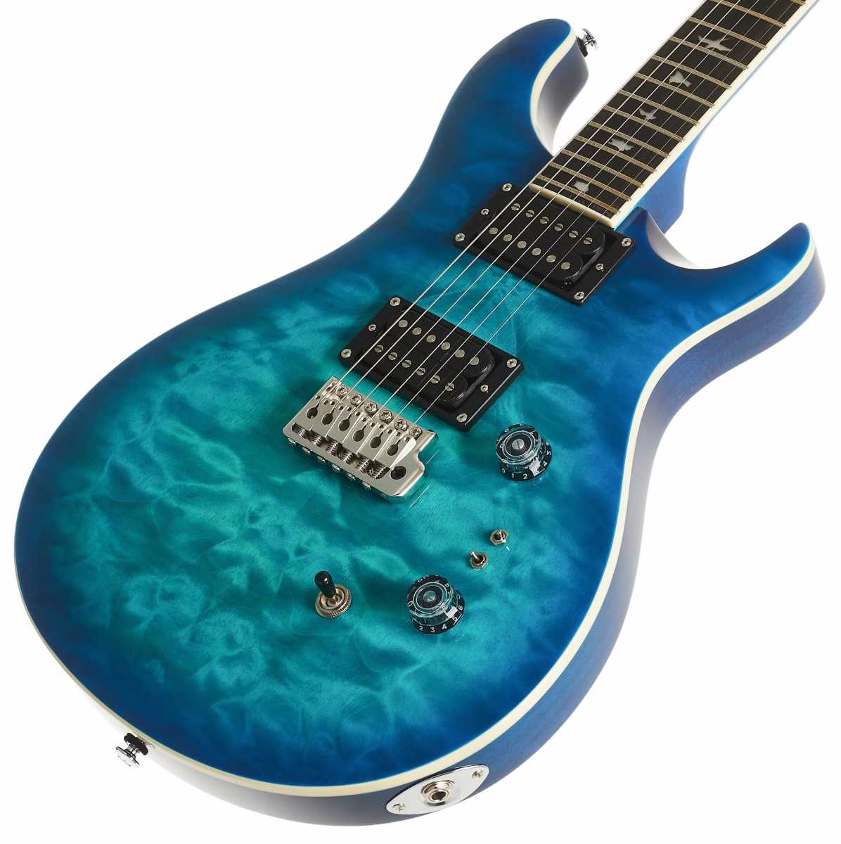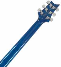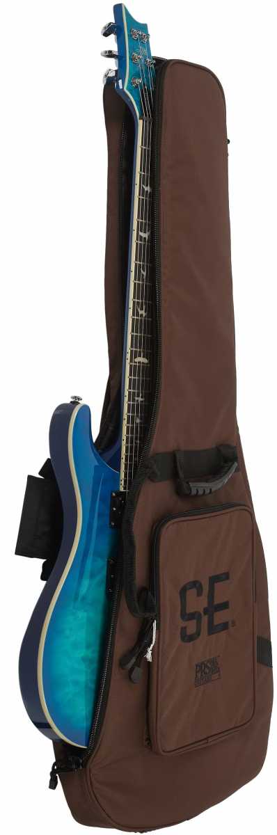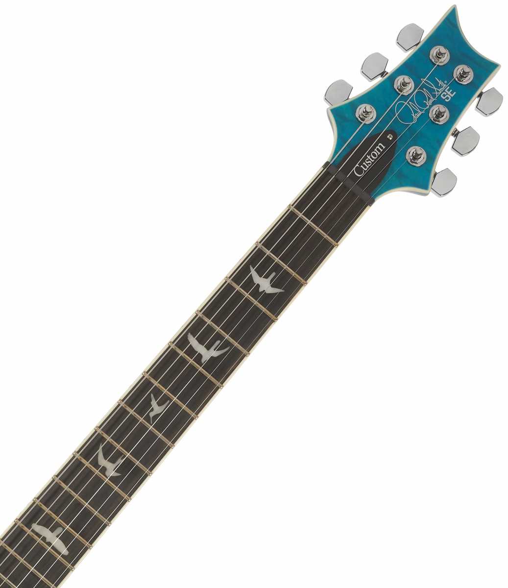 Mahagonové tělo kytary SE Custom 24-08 Quilt Package Lake Blue zdobí javorový top a efektní vrchní dýha z obláčkového javoru. Výřez Shallow Violin carve přibližuje kvalitou herní vlastnosti nástroje k dražším americkým modelům série Core. K javorovému krku s profilem Wide Thin je přilepen ebenový hmatník osazený čtyřiadvaceti pražci. Orientaci na hmatníku usnadňují polohové značky v podobě perleťových ptačích siluet.