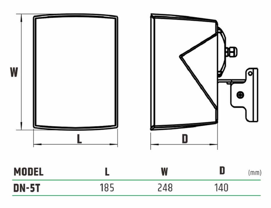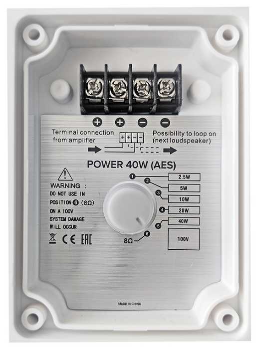 Dvoupásmová reproskříňka s 5" basovým a 1" výškovým reprodutorem s uchycením na zeď. Vyrobena je z ABS materiálu bílé barvy s hliníkovou krycí mřížkou. Reproduktor je vhodný pro ozvučení, vnějších i vnitřních prostor, jako např. venkovních teras, sportovních prostor, náměstí, restaurací, domů smutku apod.. Na zadní straně je otočný přepínač příkonu pro volbu 100 V / 2,5; 5; 10; 20; 40 W nebo nízkoimpedančního zapojení 8 Ohm (40 W).
