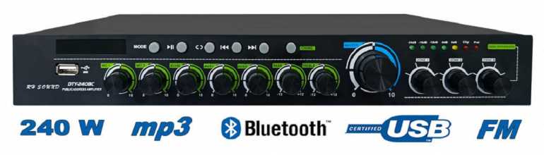 Moderní digitální (Class-D) rozhlasová ústředna malých rozměrů pro všestranné ozvučení se zabudovaným MP3 přehrávačem z USB a přehráváním MP3 přes BLUETOOTH.