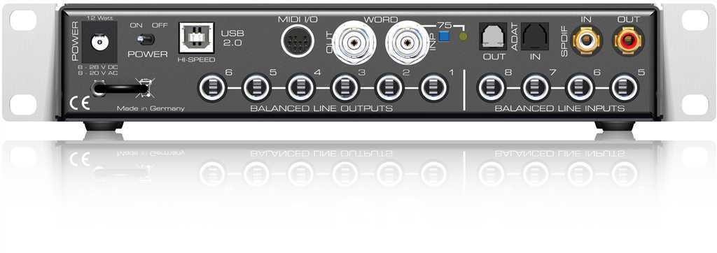 Vstupy 5-8 na zadním panelu je možno nastavit na úrovně -10dBV, +4dBu a LoGain, což odpovídá úrovním +2 dBV, +13 dBu und +19 dBu v digitální škále. To samé platí pro analogové výstupy 1-6. Vysoce výkonný sluchátkový výstup nabízí možnost hlasité reprodukce i pro sluchátka s nízkou impedancí a je možno jej použít jako nezávislé výstupy 7/8. Všechny výstup je možno nezávisle použít i pro Direct Monitoring.