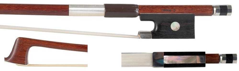 Výborná kvalita fernambukového prutu/tyče;Kulatá tyč, Peccatte špička;Ebenová žabka s jednoduchým očkem;3-dílná hůlka včetně perleťového očka;Hnědá kůže;MsNi vinutí;Razítko "C. Malot";