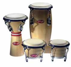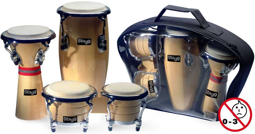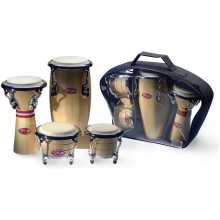 Sada malých dřevěných perkusí. Obsahuje 1x mini djembé 3 3/4" + 1 mini congo 4" + 1 mini bonga 3 1/8" a 3 3/4". Lakované dřevěné korpusy, ergonomický hardware a přírodní blány. Dodáváno v pouzdře. Víc než jen hračka!: Djembe: 3 3/4" (9,5 cm)
