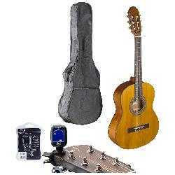 Klasická 3/4 kytara v sadě s přepravním pouzdrem a ladičkou. Vrchní deska nástroje, spodní deska a luby lípa, hmatník a kobylka kompozitní ořech. Barva přírodní, povrchová úprava matný lak. Pouzdro pro 3/4 klasickou kytaru má vnější kapsu, dva ramenní popruhy a ucho pro přenášení. Materiál nylon, barva černá. Klipová ladička nabízí několik módů ladění: chromatická, kytara, baskytara, housle, ukulele. Vysoká přesnost 0,5 centů, rozsah ladění A0 - C8. Rotační klip pro uchycení na jakoukoliv kytarovou hlavu nebo jiný plochý povrch. LCD displej, napájení pomocí přiložené 3V baterie.: