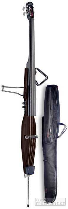 3/4 elektrický kontrabas. Tělo masiv javor, krk masiv javor, kobylka ebonizované tvrdé dřevo, nultý pražec černý plast, ergonomicky tvarované kovové podpěry, potažené měkkou pryží, výsuvný bodec, mechanika die-cast typu P-bass, ovládání hlasitosti a basů, indikátor slabé baterie, 1x vstup stereo mini jack 3,5 mm pro CD nebo MP3 přehrávač, 1x výstup mini jack 3,5 mm pro sluchátka, 1x výstup jack 6,35 mm. Součástí dodávky černé nylonové pouzdro. Barva tmavě hnědá.: Tělo: masiv javor