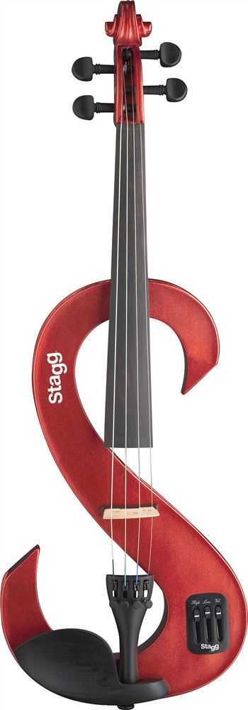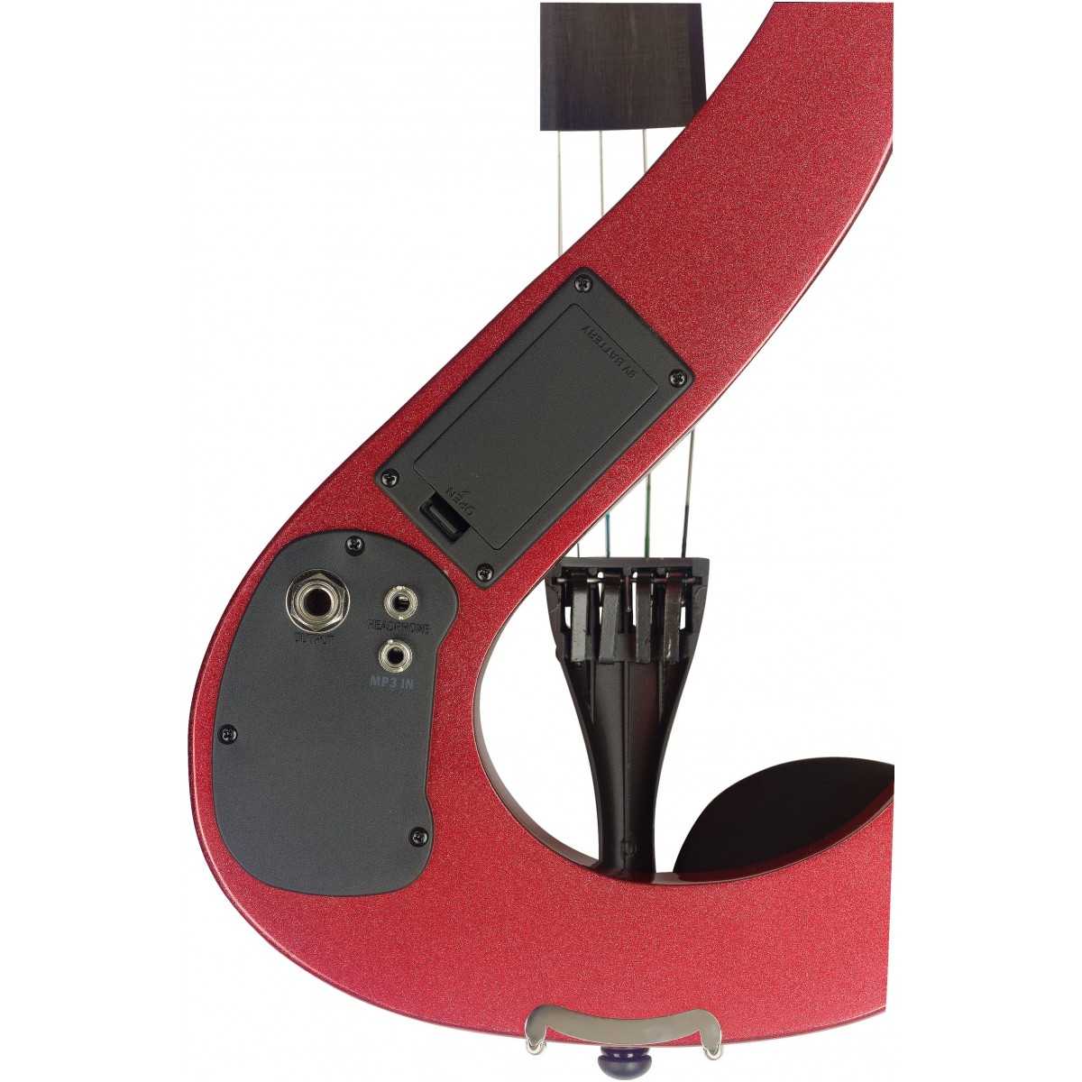 4/4 elektrické housle. Tělo masiv javor, menzura 325 mm, celková délka 590 mm, krk javor, hmatník mořené dřevo, kobylka javor, struník černý plast se čtyřmi dolaďovači, podpěra brady a ladící kolíčky černý plast. Aktivní elektronika, 3-pásmový ekvalizér s ovládáním hlasitosti, basů a výšek, vstup mini jack 3,5 mm pro CD nebo MP3 přehrávač, sluchátkový výstup mini jack 3,5 mm, výstup Jack 6,35 mm. Dodáváno vč. vyztuženého nylonového pouzdra, smyčce, kalafuny, sluchátek a 9V baterie. Barva červená metalíza.: Tělo: masivní javor