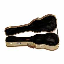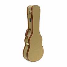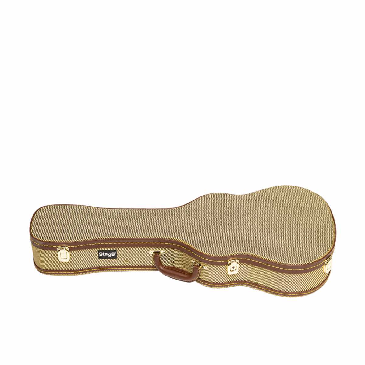 Tvarovaný kufr pro barytonové ukulele, povrch odolný zlatý tweed, vnitřek černá plyšová výstelka, schránka na příslušenství, zámky z eloxované oceli (zlaté provedení), polstrované ucho. Vnitřní rozměry 77 x 26 x 8 cm.: Materiál: Tweed (potah), dřevo (tělo) a černý plyš (interiér)