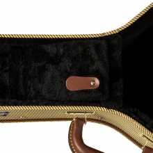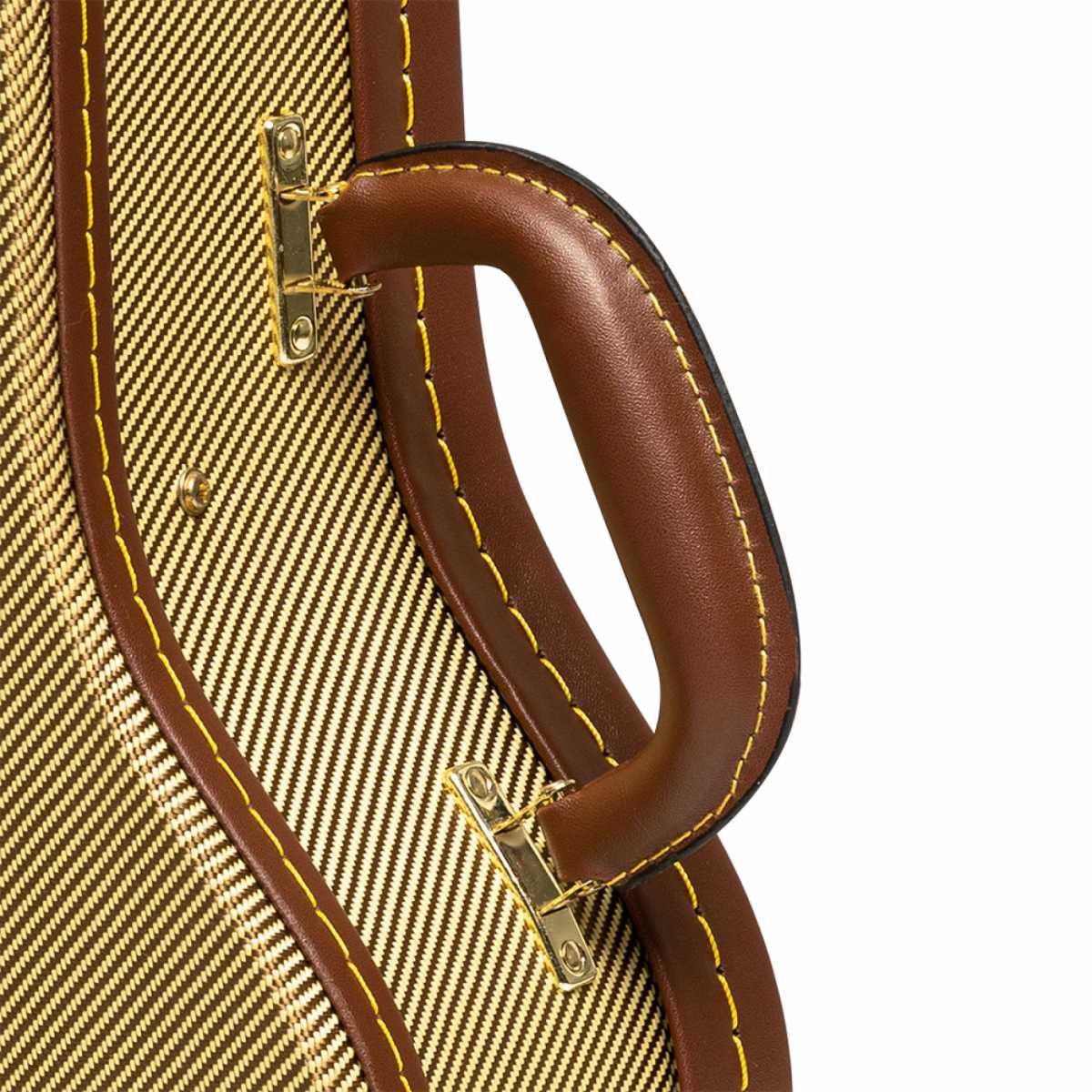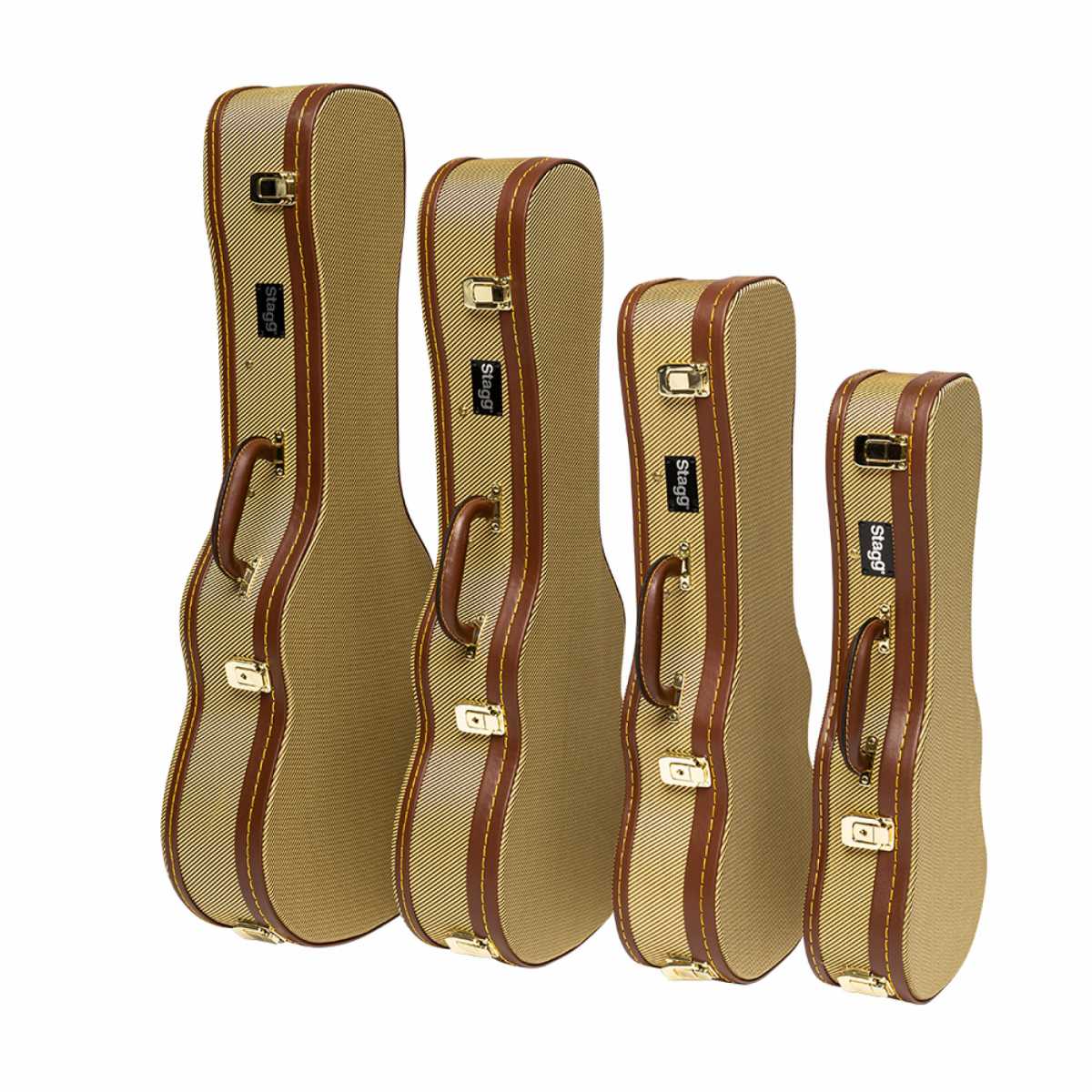 Tvarovaný kufr pro tenorové ukulele, povrch odolný zlatý tweed, vnitřek černá plyšová výstelka, schránka na příslušenství, zámky z eloxované oceli (zlaté provedení), polstrované ucho. Vnitřní rozměry 71 x 25 x 8 cm.: Materiál: Tweed (potah), dřevo (tělo) a černý plyš (interiér)