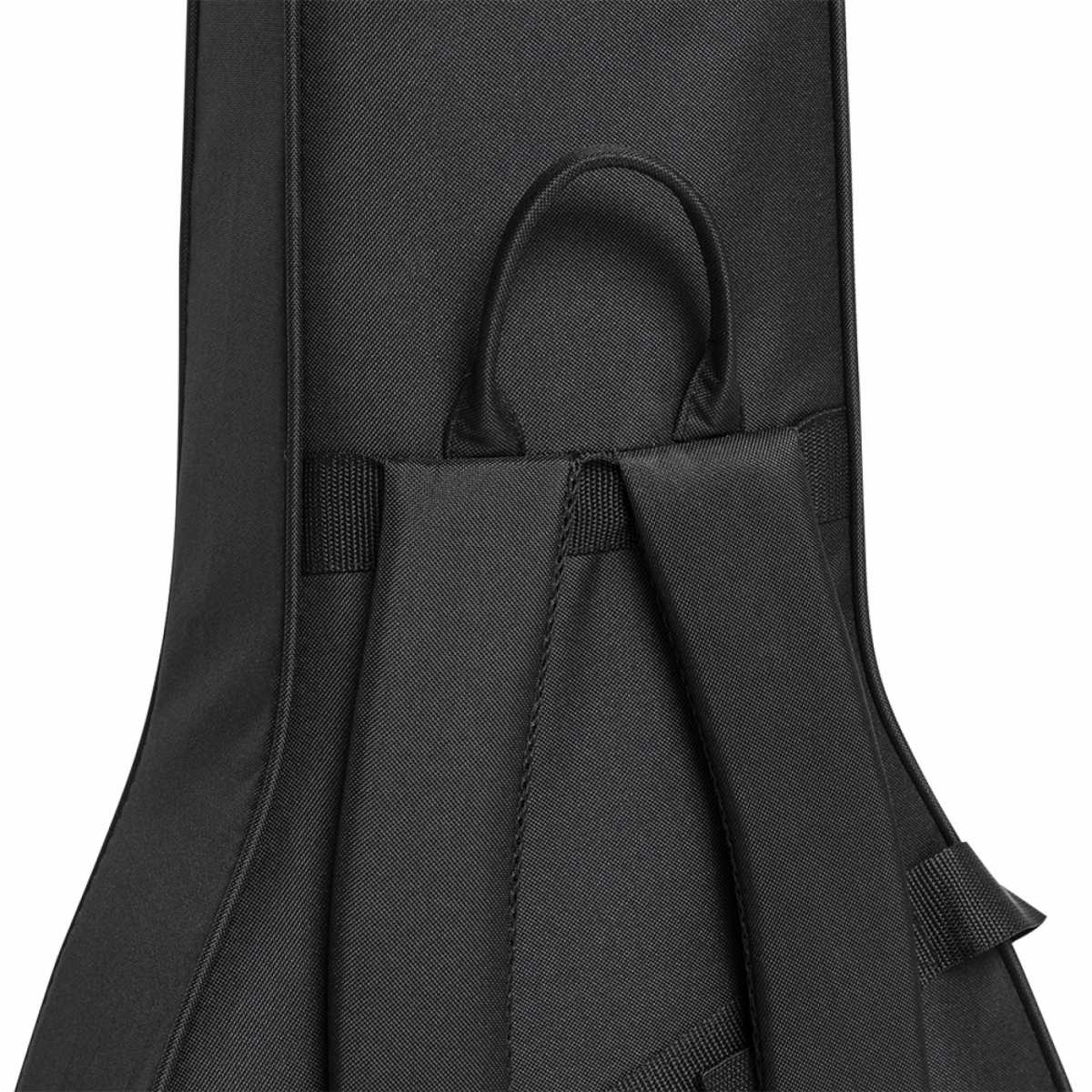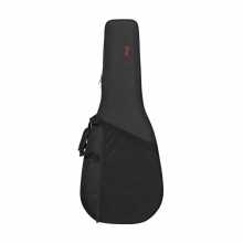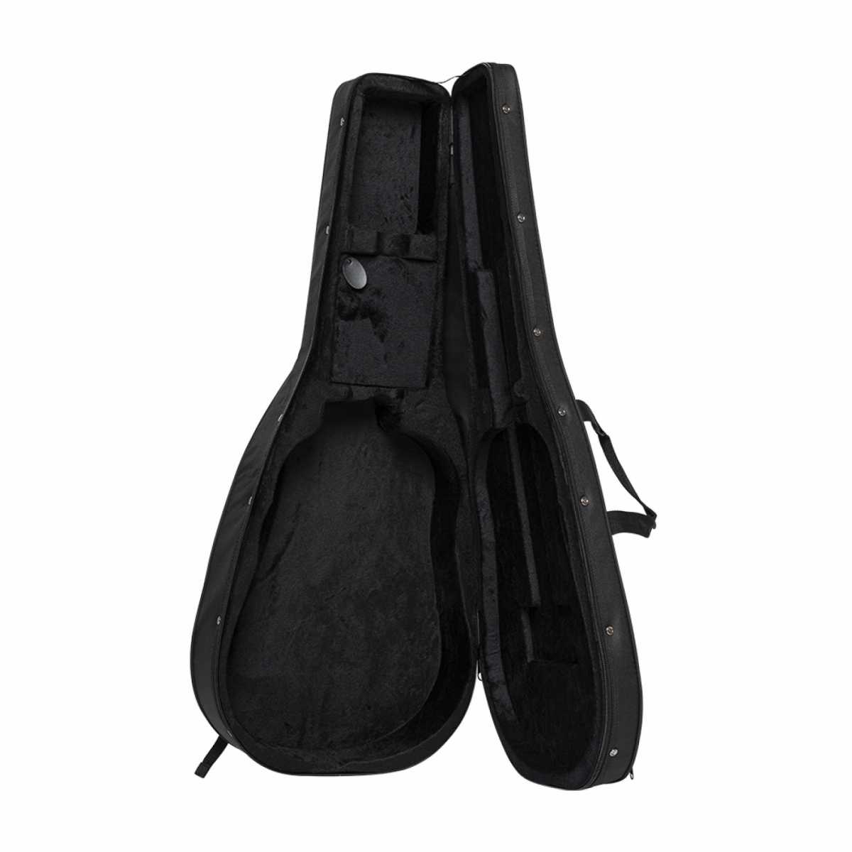 Lehký kufr pro akustickou kytaru, povrch pevný černý nylon, zavírání na zip, vnější kapsa, horní a dolní část vyztužena dřevem, tvarovaný vnitřek s měkkou výstelkou a schránkou na příslušenství, pevné ucho a ramenní popruh.: Materiál: expandovaný polystyren vyztužený dřevem a potažený nylonovou tkaninou, sametová vnitřní výstelka
