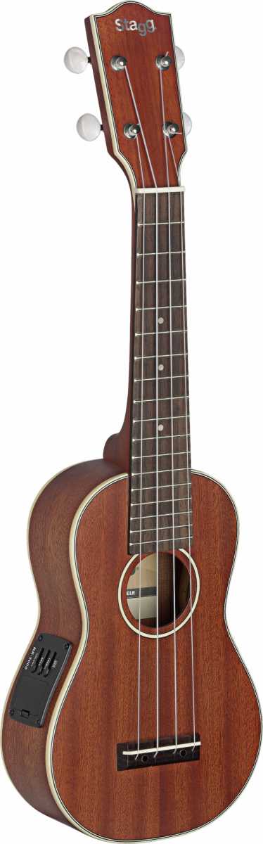 Sopránové ukulele elektroakustické. Horní deska, zadní deska a luby masivní mahagon, krk a hlava mahagon, hmatník a kobylka palisandr. Okraje těla, hlavice a ozvučný otvor lemovány černou a bílou výložkou. Mechanika s plastovými knoflíky - barva "starožitná bílá". Hmatník 177 mm, 17 pražců, menzura 349 mm, krk a hlavice 300 mm, korpus 240 mm, celková délka 540 mm. Elektronika UK-2000, aktivní, 2-pásmový ekvalizér (basy / výšky) a ovládání hlasitosti. Výstup 1x Jack 6,3 mm. Povrchová úprava přírodní matný lak. Dodáváno vč. nylonového povlaku.Gigbag