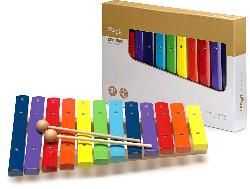 Xylofon s 12 barevnými dřevěnými kameny a dvěma dřevěnými paličkami. Rozsah 1 1/2 oktávy (A až E), rozměry 36,5 x 23,5 cm.: Materiál: Ailanthus