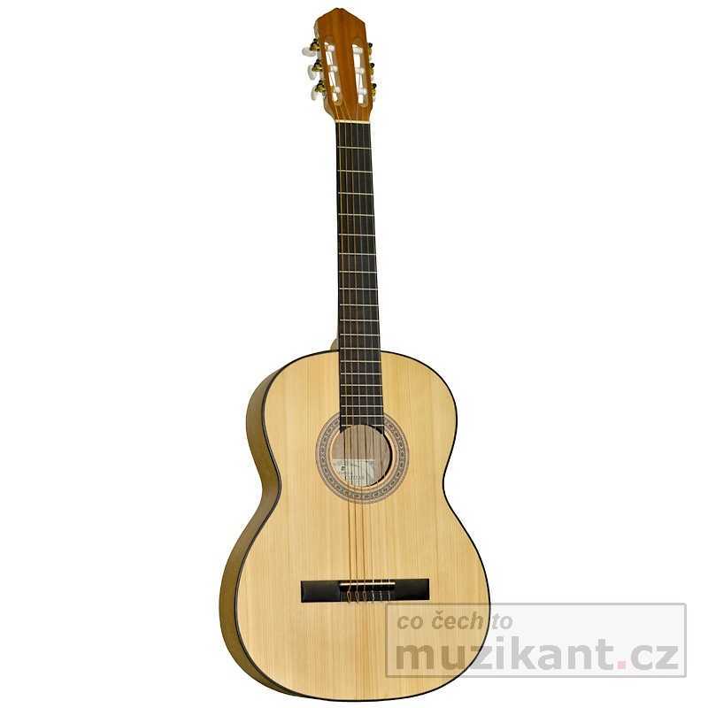4/4 klasická kytar Strunal, vrchní deska smrková dýha, krk, hmatník a kobylka buk, ocelové struny, otevřený pór.