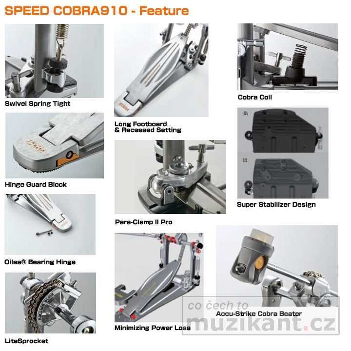 Tyto vlastnosti pedálu Speed Cobra jsou kombinací nově vyvinutých a použitých mechanismů jako Fastball Bearing a LiteSprocket. Nový Projector Beater dává vašemu basovému bubnu bohatší rezonanci a zvyšuje jeho projekci. Nově vyvinuté pružiny Super Spring v kombinaci s Cobra Coil vám umožní hrát v neskutečné dynamice a rychlosti bez pocitu svalového napětí. Speed Cobra umožňuje hrát všechny možné jemné nuance a vytvořit si svůj vlastní styl hraní. Extrémní rychlost a opravdová síla Speed Cobry jsou pocity které jste ještě u žádného pedálu necítili.